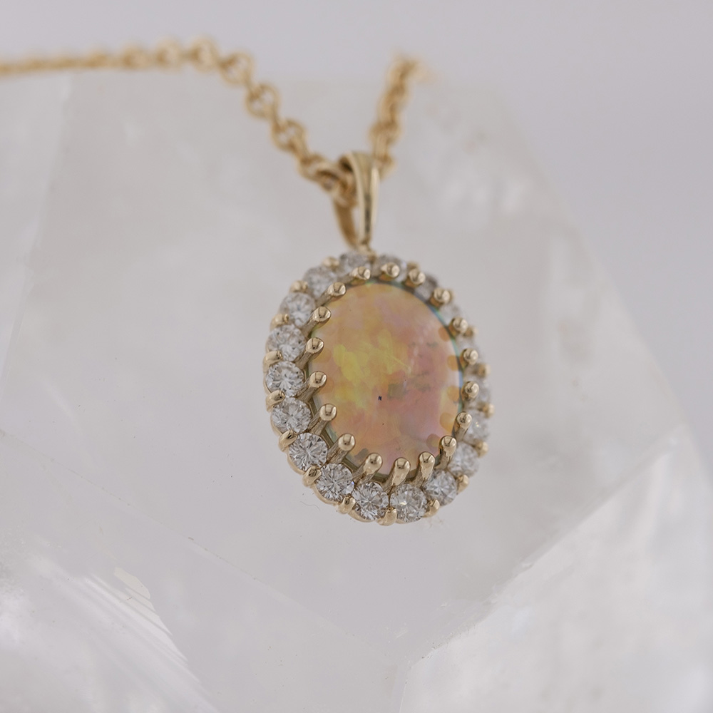 An oval crystal Australian opal with a diamond halo on a 16″ cable chain with lobster clasp.