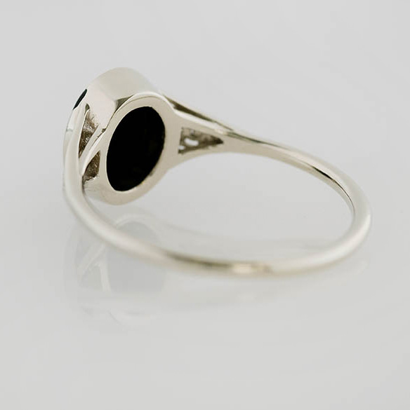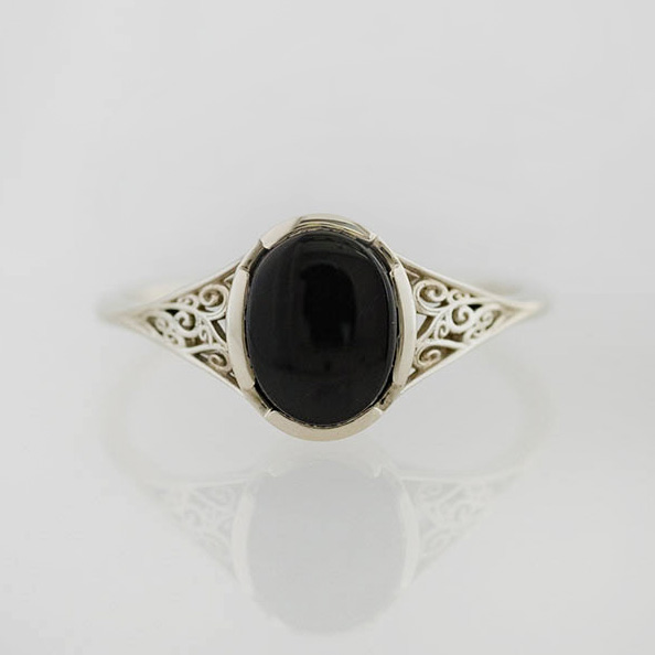 A black oval buff top onyx set in low profile and handcrafted filigree in 14K white gold.