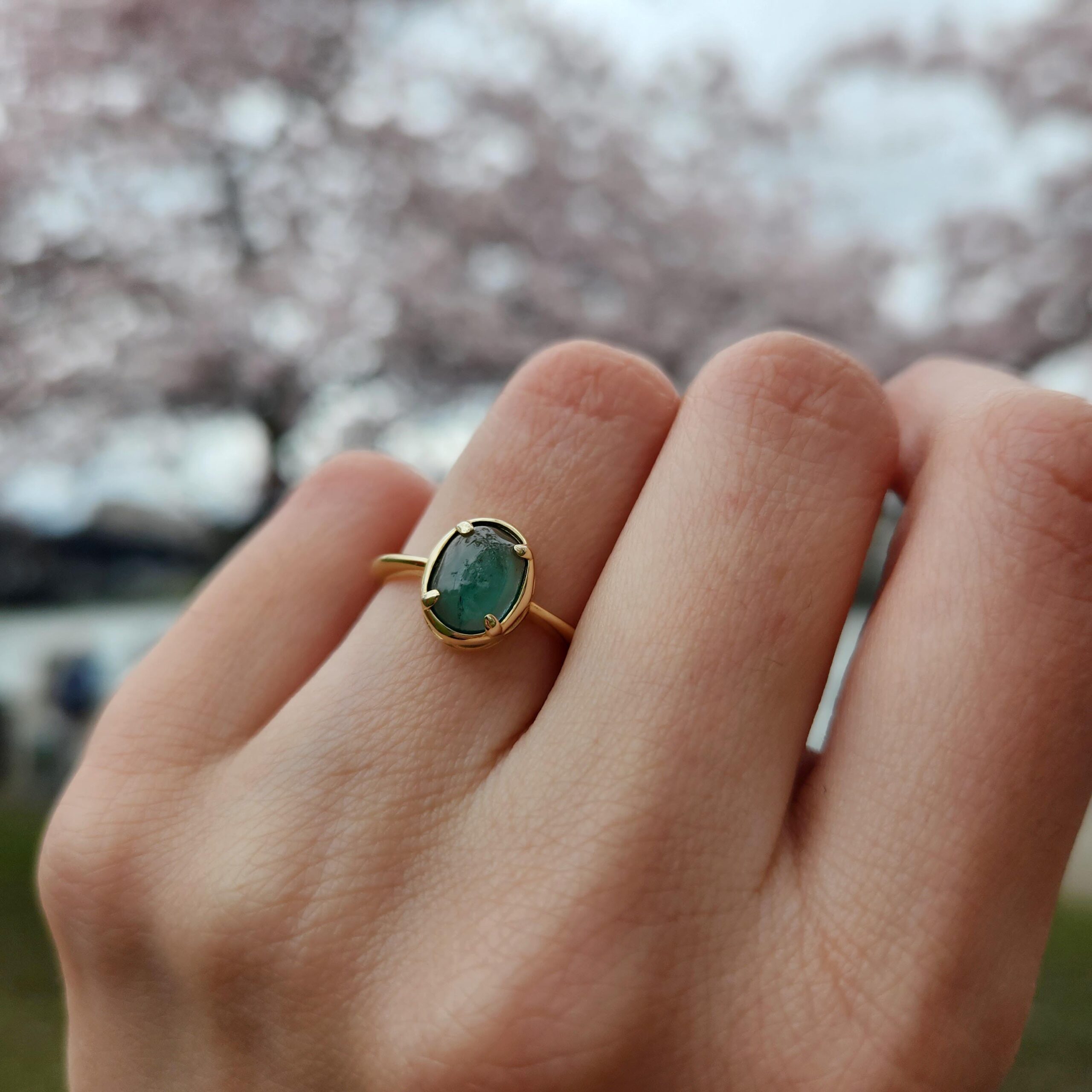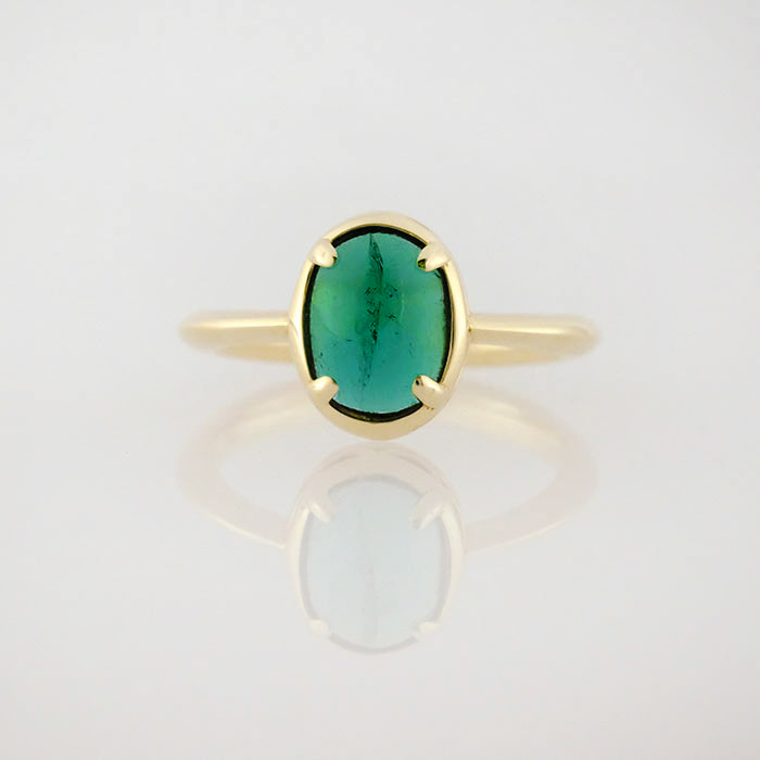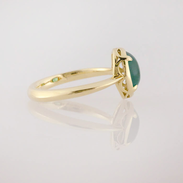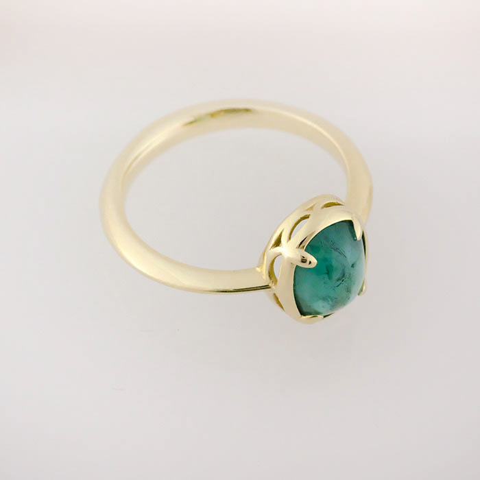 Cabochon emerald soliatire, bezel set with four prongs, in a 14K yellow gold band.