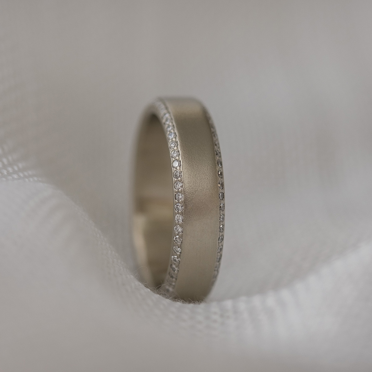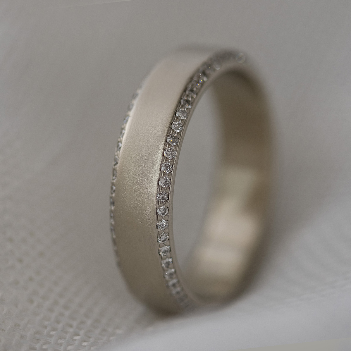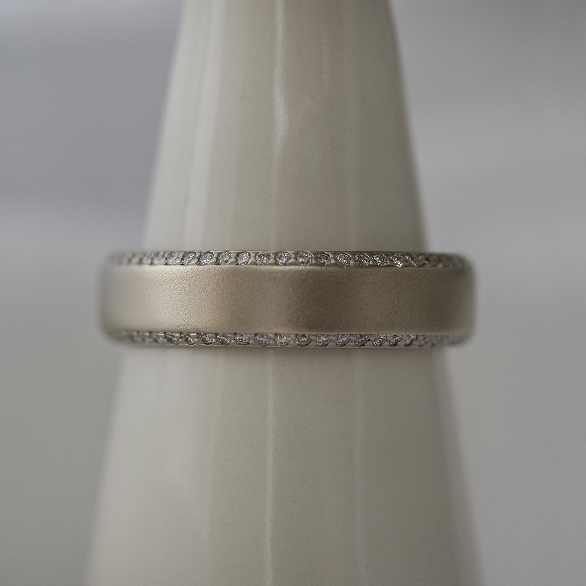 A double-sided pave band featuring 60 round diamonds, set flush, on each side of the band, finished in a matte 14K white gold.