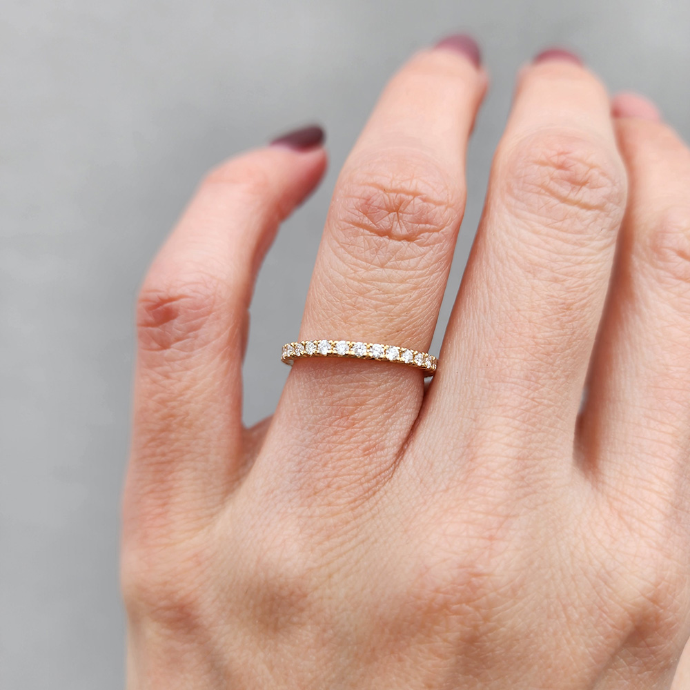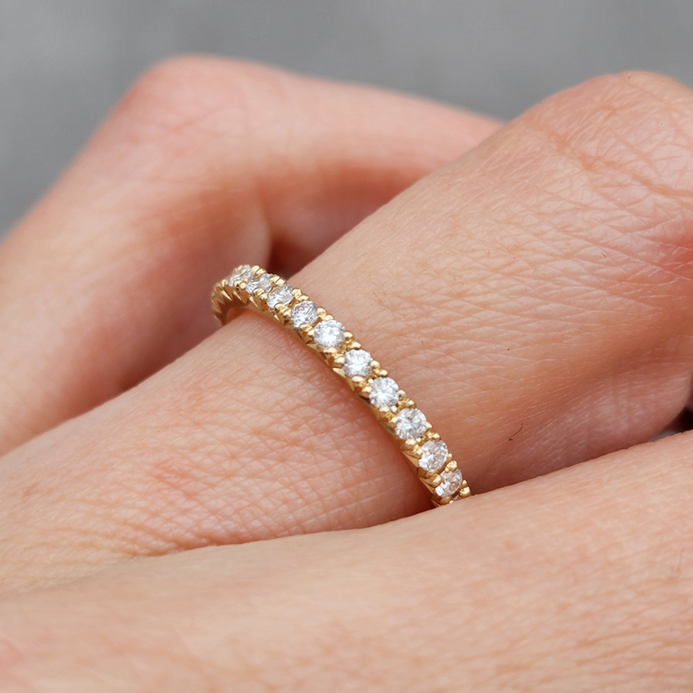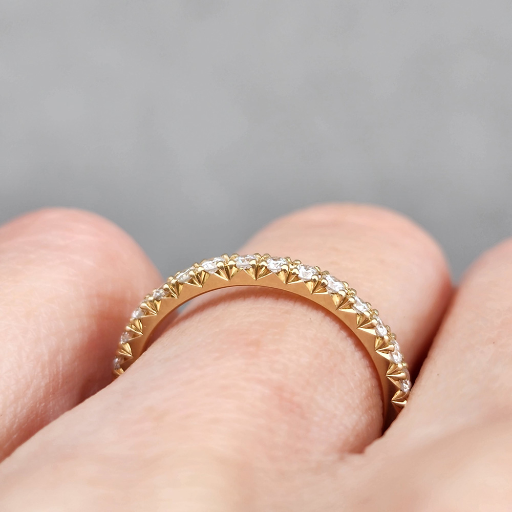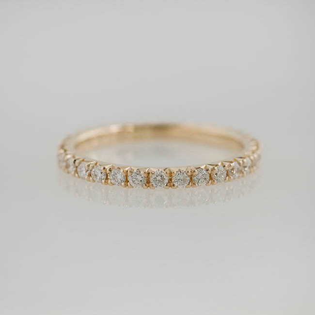 Hand-fabricated Eternity French-cut diamond ring in 14K yellow gold.