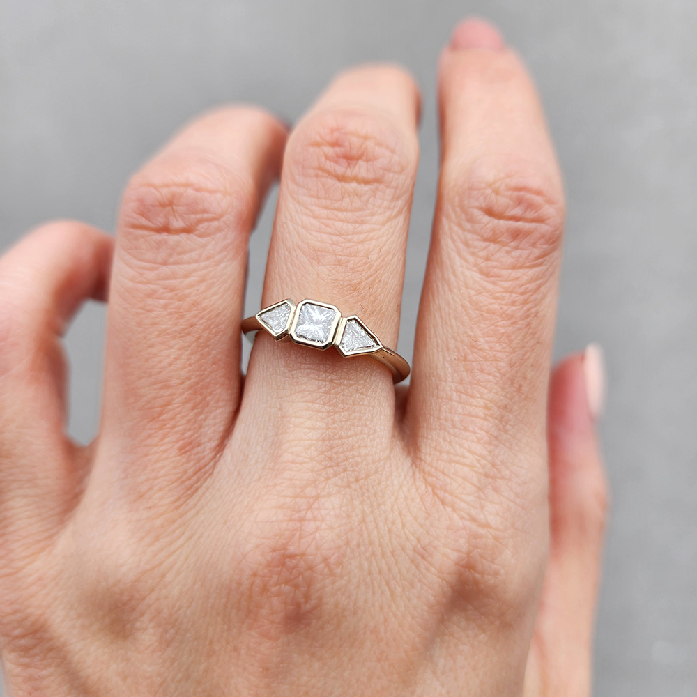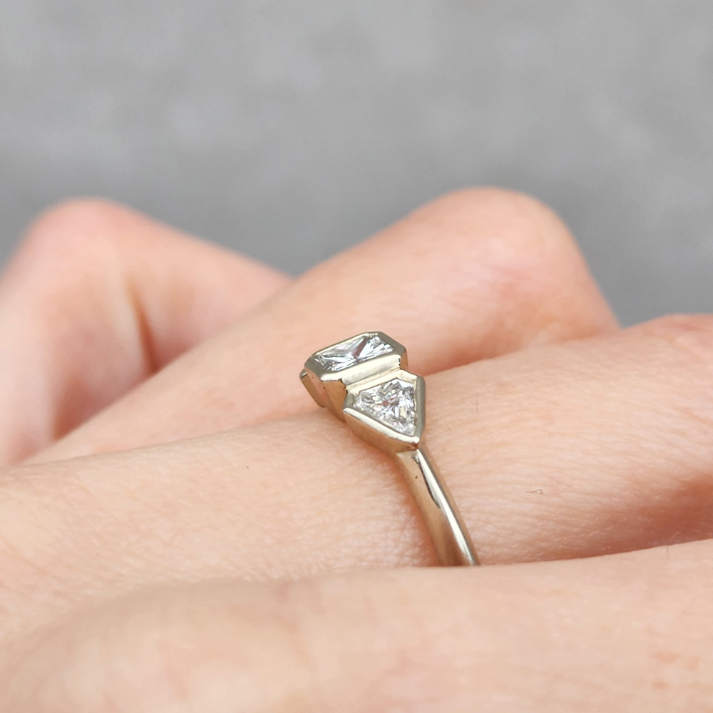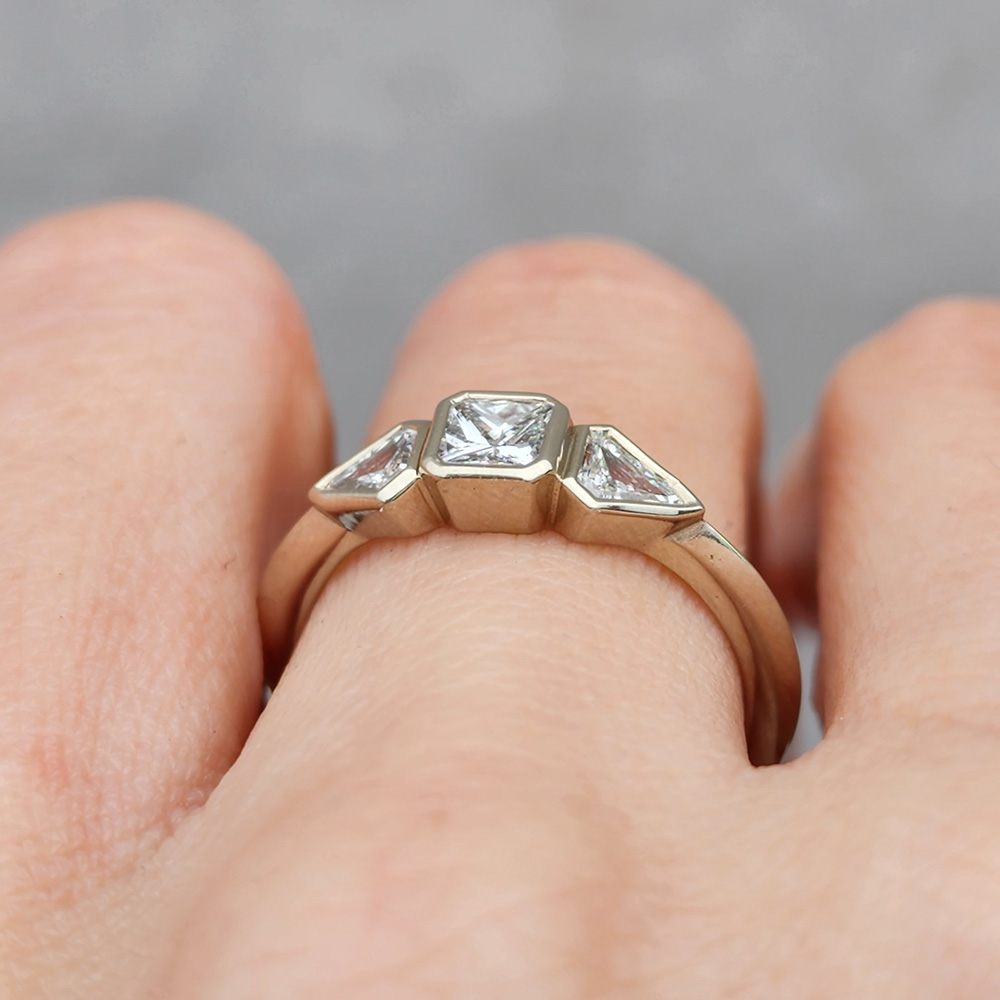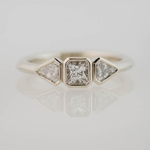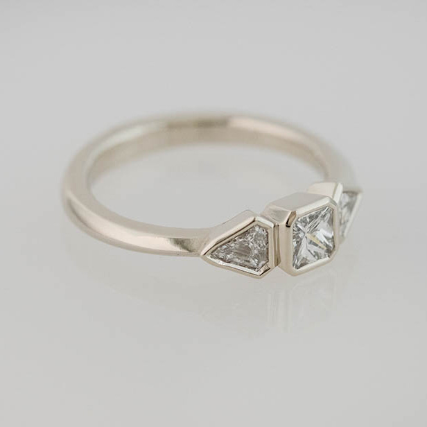 A center radiant square cut diamond flanked by a pair of step-faceted shield-shaped diamonds, bezel set in 14K white gold.