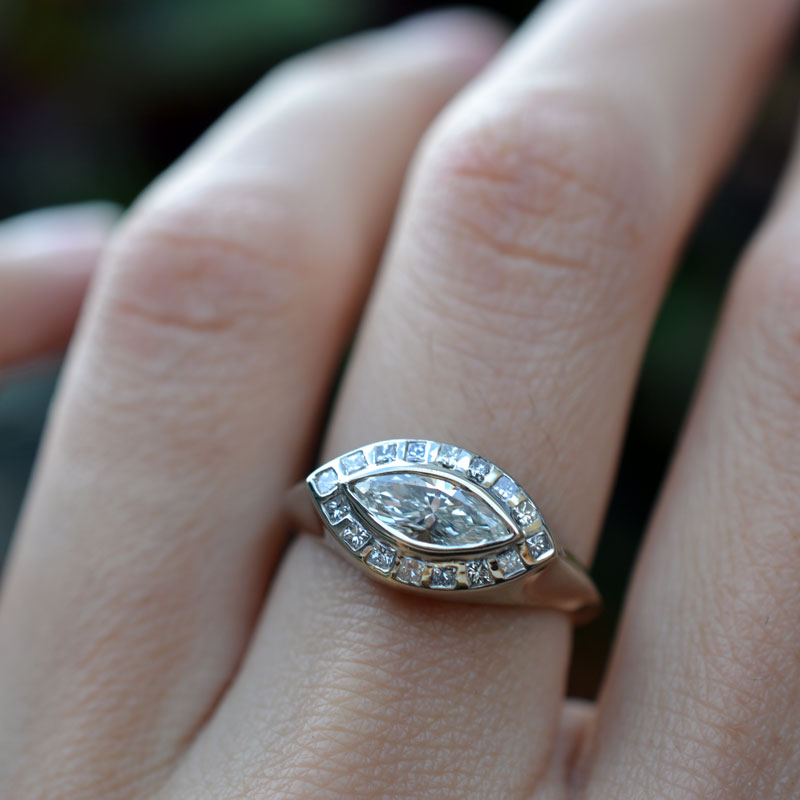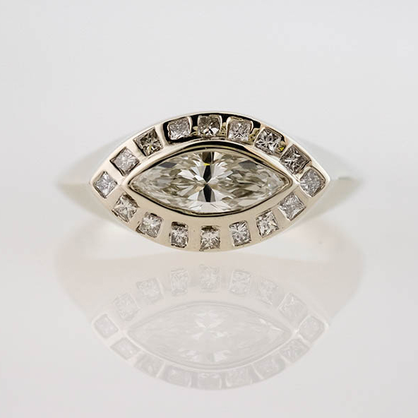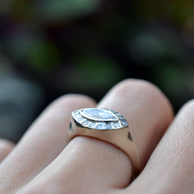 A unique signet ring featuring a marquise diamond surrounded by princess cuts, all flush set. Knife-edge shank.